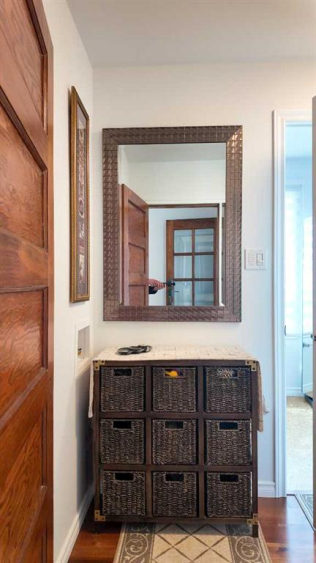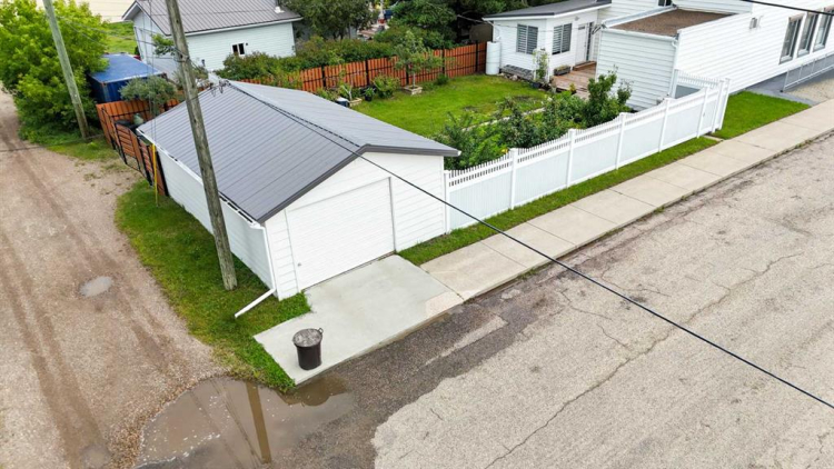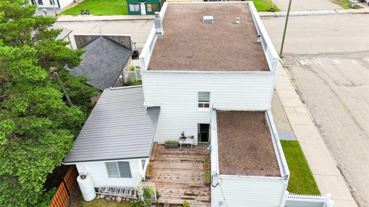 A rare opportunity to own a truly unique live-where-you-work property in the heart of Delburne. This well-maintained two-storey building sits on two full lots and offers a versatile mix of commercial and residential space, perfectly suited for a variety of uses. Originally built as a Bank of Montreal branch, the property retains its solid construction, full concrete basement, and even the original operational bank vault, while benefiting from extensive modern upgrades throughout. Ideally situated on Main Street, next to the Village office, Medical Centre, pharmacy, and other core amenities, the location offers exceptional visibility and convenience. Free parking is available at the front and rear of the property for both clients and guests. The main floor offers approximately 1,231 square feet of air-conditioned commercial space, featuring a flexible layout that includes a front office, multifunctional rooms, two former certified commercial kitchens, retail areas, and the secure vault. With three separate entry points , commercial grade laminate flooring— including an accessible front entrance with ramp, a backyard entry, and a private entrance to the residential quarters — the layout lends itself perfectly to retail, professional services, hospitality, or other business ventures. The full basement provides even more usable space, including laundry facilities, a half washroom, finished rooms, and a secure, lockable concrete storage area ideal for inventory or records. The upper level is fully renovated to the studs with a contemporary finish and a smart layout. On this floor there is engineered flooring with hardwood on the stair runs. Here you’ll find two bright bedrooms, an office/den, plus a beautifully finished full bathroom with onyx tiles and cork flooring, rough-in for laundry, and two walk-in closets. The updated kitchen is open to a spacious dining area, which flows to the large living room featuring a sunny balcony with exterior stairs. Tilt-and-turn windows throughout the upper level flood the space with natural light. Outside, a big deck connects to a sunroom/veranda overlooking the fully fenced backyard with fruit trees, garden plots, and ample off-street parking. The oversized detached garage is finished on the exterior with wood siding and includes a workbench, shelving, and room for a large vehicle with direct access to the street. The main building exterior is finished with vinyl siding. With modernized electrical, plumbing, windows, and 200-amp service already completed, this property combines peace of mind with endless flexibility. Live on site, operate your business. — the possibilities are truly exceptional. Where else can you live in such history, with impressive updates, and at this price, come view this today!! Plus, to make it even more attractive, seller is willing to provide seller financing on the right deal.