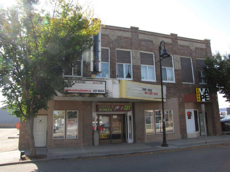 Historic Building downtown Innisfail (built in 1928 ) 9000 +/- sq ft building . Let your creativity flow. Operated for almost a Century as a Live Entertainment center and Movie Theatre ( digital equipment ). Known as Century Theatre . Presently 3 revenue streams with the Auditorium as a future 4th 1./Residential apartment, 2./Retail store, 3./Lobby area. Presently the Auditorium is not being operated. Main lobby has ticket counter, concession area with glass counters and display case plus stainless sink counter , all Equipment included. Also has office area , numerous windows , and storage room. Auditorium has EXCELLENT ACOUSTICS (ask Gord Bamford or Brett Kissell if you want an Artists opinion ) and is also set up for movies (2D and 3D )all Digital equipment as well as the Drop down Screen . Seating area is 60 ‘ by 36′ 10 “, Ceiling is around 16 ft high and is hand painted tin , 60 Upgraded Seats with cup holders and 170 regular seats on a sloped floor plus space for handicapped patrons. 2 handicapped accessible bathrooms. Screen is 28’11″x 15′ and lifts up for live shows on the 36′ 10” x 16’ stage. There is a back stage plus huge storage and work areas on both sides of the auditorium. There is also a Sound ,light control room plus concession storage room . Other events held in Theatre space include , birthdays, private rentals, company appreciation nights, power point presentations, group rentals, even weddings, capacity for 270+ people. It may be possible to have two movie screens. Upper Rental suite is around 1100 sq ft w/ 2 bedrooms, office , kitchen ,laundry , 4 pce bath and living room ( present tenant 8 yrs ) All windows replaced . COCO vap leases West unit Street level which is 900 +/- sq. ft , it has front retail area , two offices and large common area , 2 pce bathroom( lease in place) Lots of potential, I would say an Entrepreneurs dream . Historic designation for the building may be possible. Century Theatre Company has owned and operated the building for 25 yrs. GST is applicable. More information in supporting documents (also copies of original plans). Seller may consider financing. Note some upgrades in progress.