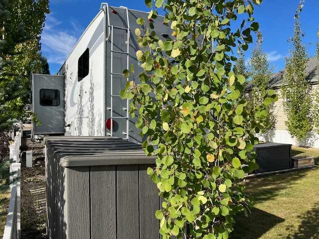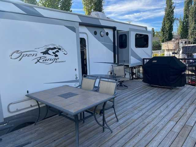 This great property includes a 2017 Highland Ridge Open Road, 42’ fifth-wheel RV featuring five slides, 2 bedrooms, 2 bathrooms, a full-size fridge with ice & water, & 2 Air conditioning units providing an exceptionally spacious and well-designed interior, ideal for extended stays or entertaining. Check out the floorplan. The custom-built west facing deck, creates the perfect outdoor space for relaxing, BBQing and visiting with friends and family.