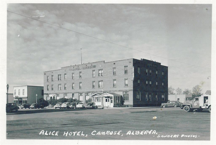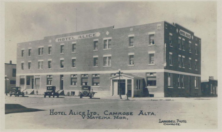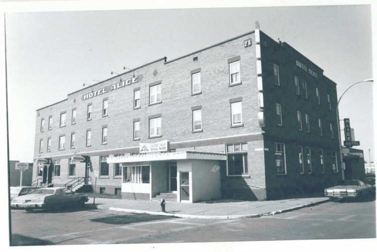 Built in 1928, the Alice Hotel was extremely large and modern for the time. It boasted 52 rooms, hot and cold running water, baths, telephones in the rooms and a large dining room. It was built by prominent local businessman Valclav Matejka who came to Camrose in 1905. He named the hotel after his daughter Alice, and the hotel has continued to bear her name ever since. Over decades, the rooms were enlarged with private bathrooms & sitting areas, reducing the room count to 23.